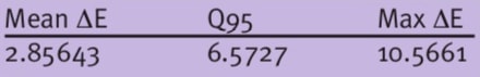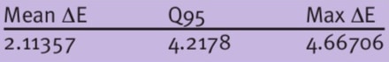 The RGB values obtained in this way are mapped to the XYZ values with a 3×3 matrix, M. The statistics of the differences in the color distance measure ∆E are determined according to CIE2000. Matrix M is determined using the least squares method.