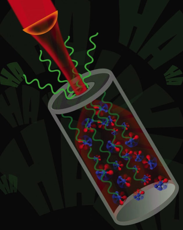 The researchers teamed up with Federico Capasso, of Harvard University, a pioneer in the development of QCLs, who provided a laser that produced a range of power that their theory predicted would work with a cavity the size of a pen (about 1/1,000 the size of a conventional cavity). The researchers then looked for a gas to spin up.