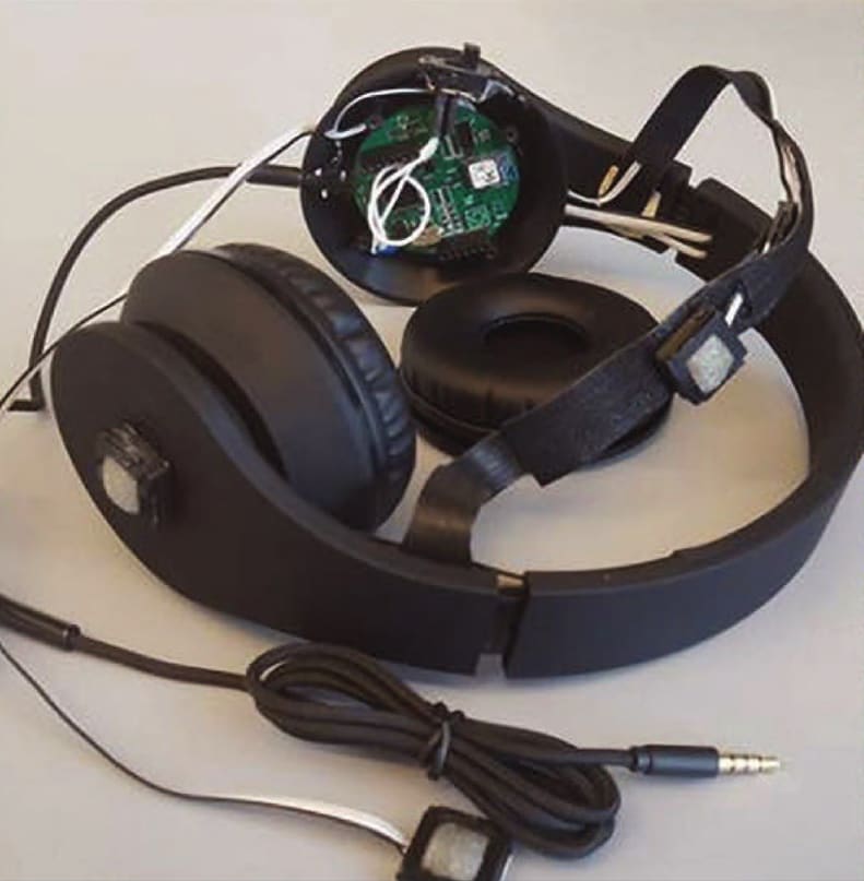 The PAWS headset. The front-end hardware is exposed inside the left ear housing.