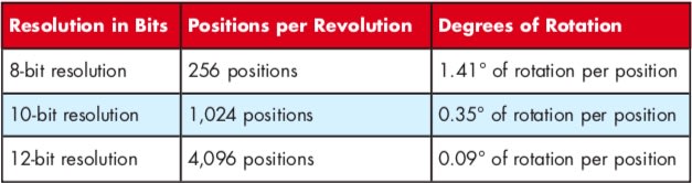 So which encoder is more accurate? Here is what the manufacturer states: “While the accuracy is the same for both encoders, the 12-bit version provides higher resolution.” This example shows that accuracy and resolution are not related to each other. One term — accuracy — describes target position vs. actual position. The other term — resolution — describes how finely a disk is divided. These are independent properties. If our novice designer needs an encoder that can report positions every tenth of a degree, then the designer needs more resolution, not more accuracy and the 12-bit encoder would be a good choice.