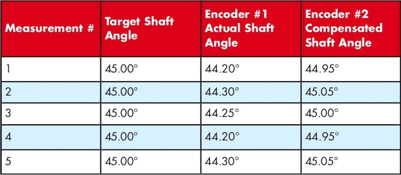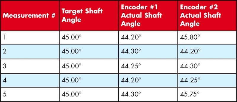 Precision, then, is the amount that successive measurements differ from each other. An encoder that has position errors that are repeatable may have good precision, even though it may not be perfectly accurate. In this case, the precision can be used to compensate for the inaccuracy of the encoder; for example, let’s look at successive measurements made for two encoders (Table 3). The target shaft angle is 45.00°.