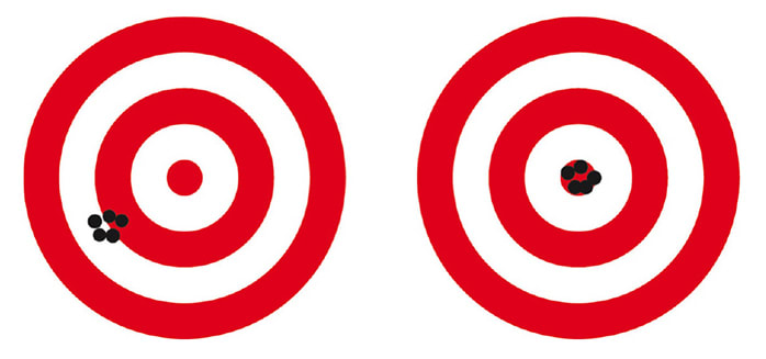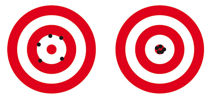 Consider arrows shot by two archers in a competition (Figure 5). Which archer is more accurate? Surprisingly, the average accuracy is similar for both targets. The average position of all the arrows on the left is in the center of the bullseye, the same as the tight grouping of arrows on the right. The difference between the two lies in the precision of the shots. The group on the left is accurate but not precise. The group on the right is both accurate and precise.
