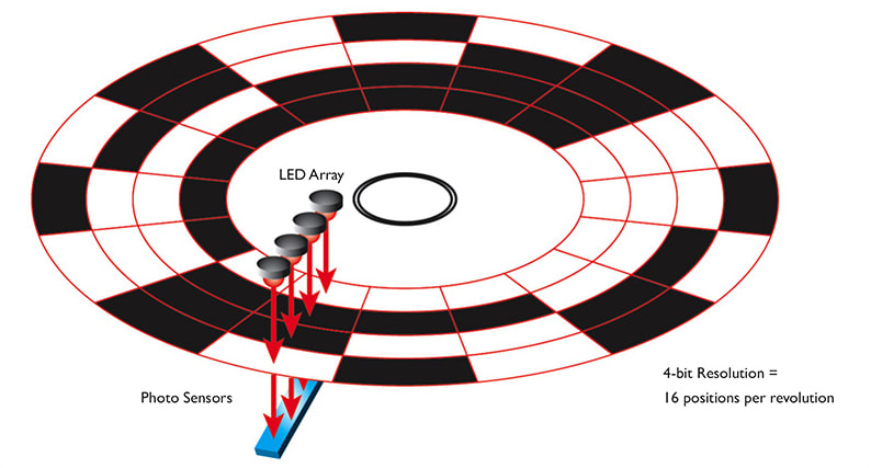 With some designs, each absolute encoder is set at one specific resolution. Some manufacturers, however, take a different approach and make disks with a single band that contains a unique bar code for each position.