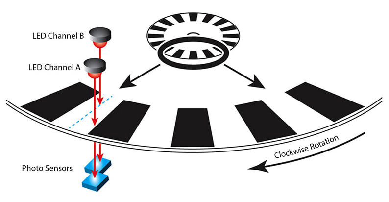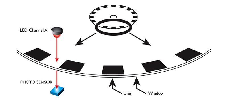 In math, science, and engineering, the word resolution specifies the smallest distance that can be measured or observed. To make an incremental encoder, a manufacturer creates a disk with a pattern on it (Figure 1). The pattern divides the disk into distinct regions; for example, one common pattern consists of lines and windows printed on a transparent disk. When an LED projects light at the disk, the light strikes either a window or a line. Windows allow light to pass through the disk to a photo sensor on the other side. Lines block the light. As the disk rotates, output from the encoder module — Channel A — is a series of high and low signals; their value depends on whether the photo sensor receives light (high) or not (low).