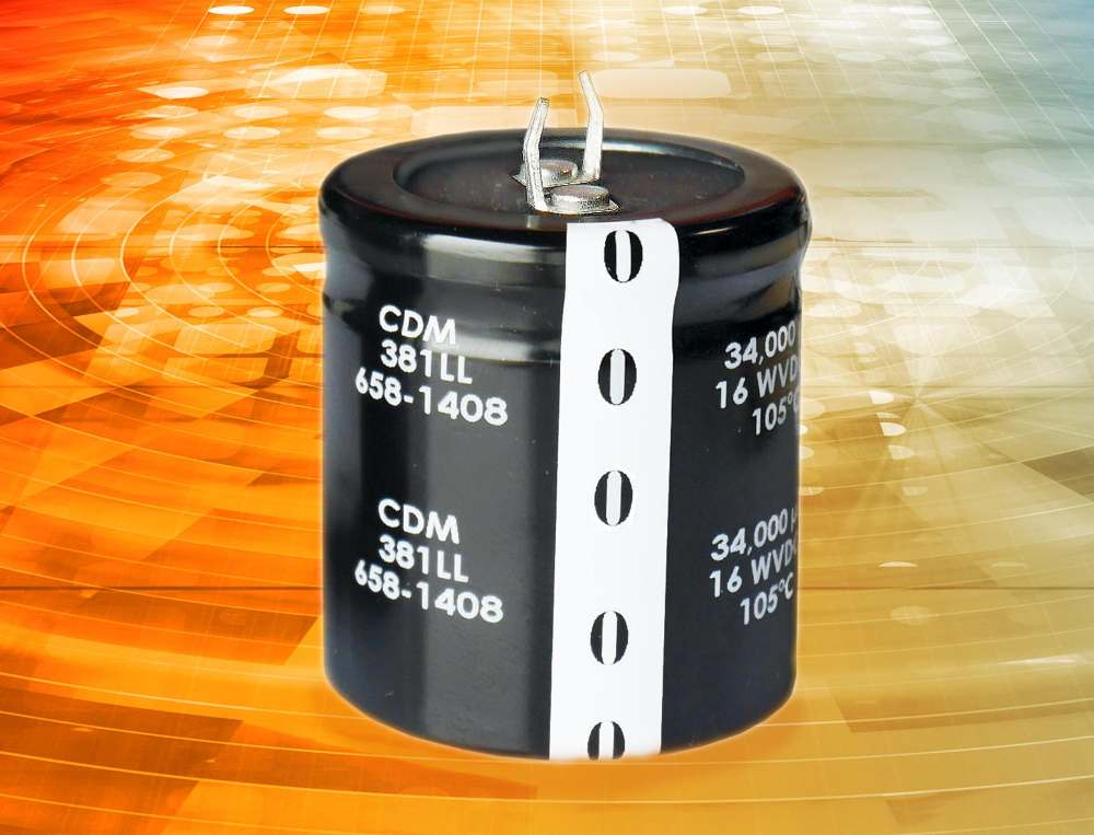 The 381LL series of snap-in aluminum electrolytic capacitors from Cornell Dubilier Electronics, Liberty, SC, offers stability in capacitance and DC leakage current over time on test. Capacitance values range from 740μF to 100,000μF at working voltages of 16 to 250 WVDC with ripple current ratings up to 10 Amps @ 105 °C. T