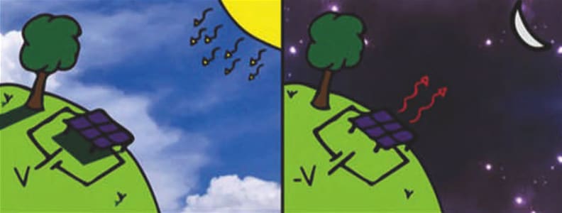 A photovoltaic cell, developed at the University of California, Davis, could generate up to 50 watts of power per square meter under ideal conditions at night — about a quarter of what a conventional solar panel can generate in the daytime. A regular solar cell generates power by absorbing sunlight, which causes a voltage to appear across the device and for current to flow. In the new device, light is instead emitted and the current and voltage go in the opposite direction but power is still generated. The device would work during the day as well if steps were taken to either block direct sunlight or point it away from the Sun.