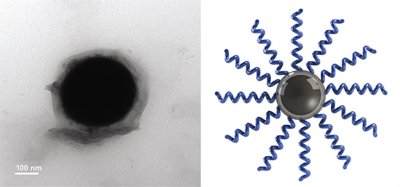 ATRP was used to attach monomer brushes to the surface of EGaIn nanodroplets. The brushes were able to link together, forming strong bonds to the droplets. As a result, the liquid metal uniformly dispersed throughout the elastomer, resulting in a material with high elasticity and high thermal conductivity. After polymer grafting, the crystallization temperature of eGaIn was suppressed from 15 °C to -80 °C, extending the droplet’s liquid phase — and thus its liquid properties — down to very low temperatures.