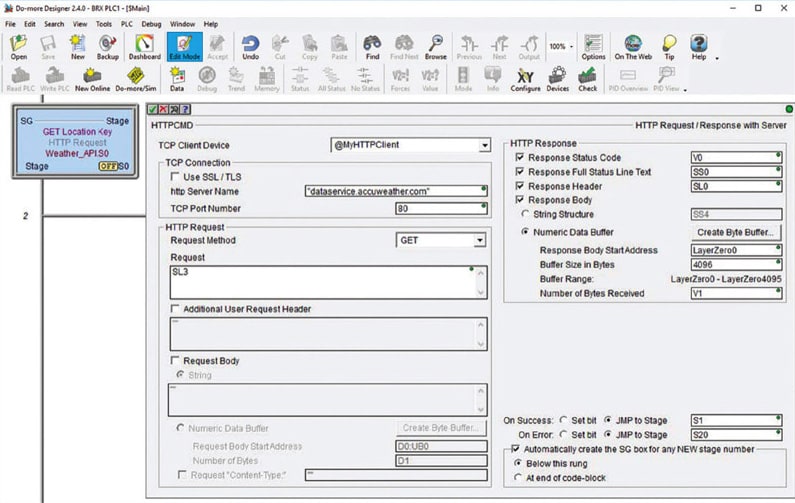 A PLC must also include a specific instruction for initiating an HTTP command to a target website (see figure). Following the API rules, the PLC HTTP command will return a compact ASCII string response in JSON format.