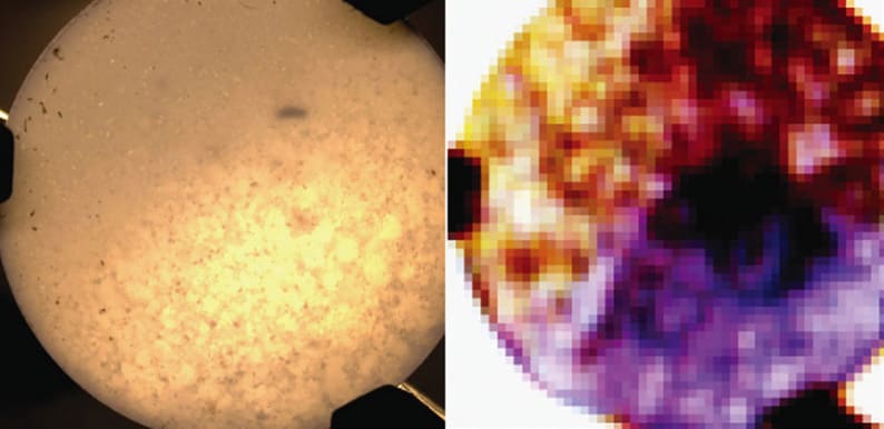 As a proof of concept, researchers created a tablet with three zones containing common inert ingredients in pharmaceuticals — forms of glucose, lactose, and histidine. The terahertz imaging system identified each ingredient and revealed the boundaries among them as well as a few spots where one chemical had spilled over into a different zone. This type of “hot spot” represents a frequent problem in pharmaceutical production that occurs when the active ingredient is not properly mixed into a tablet. They also demonstrated the system’s resolution by using it to image a U.S. quarter. Fine details like the eagle’s wing feathers, as small as one-fifth of a millimeter wide, were clearly visible.