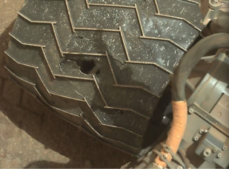 On Curiosity, the wheels are made of aluminum, he explains, which was chosen because it’s very lightweight, always an important consideration for any spacecraft, where every additional ounce comes with a price tag. But aluminum is also relatively soft, which makes it prone to damage from the terrain. This has been a real problem with Curiosity, whose wheels are already pitted with holes and cracks from driving over the rough Martian terrain.