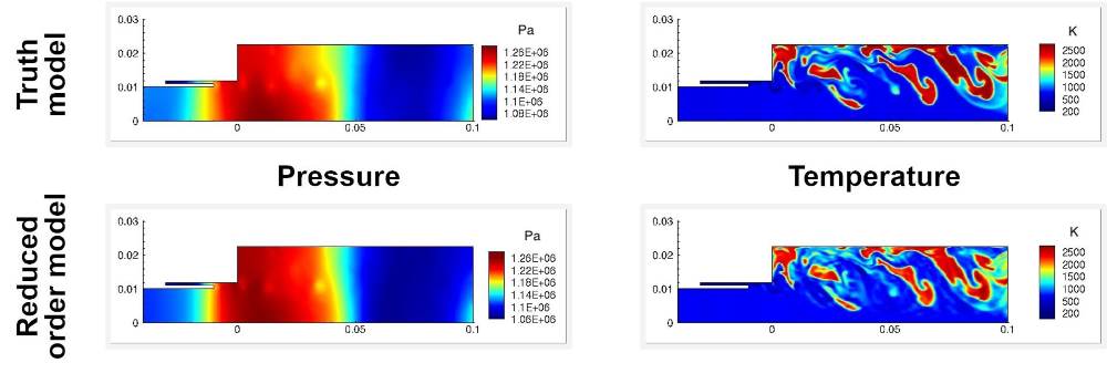 Karen Willcox: Two main things: We are embedding the physical governing equations, and we are exploiting the mathematical properties of projection onto a low-dimensional subspace. Without getting into details, this amounts to using the governing equations (conservation of mass, momentum, energy, and chemical balance) to identify structure, and then we reflect this structure in the form of the model we learn. The result is a method that enjoys the flexibility and ease-of-use of a non-intrusive data-driven machine learning approach together with the prediction power of a physics-based model.