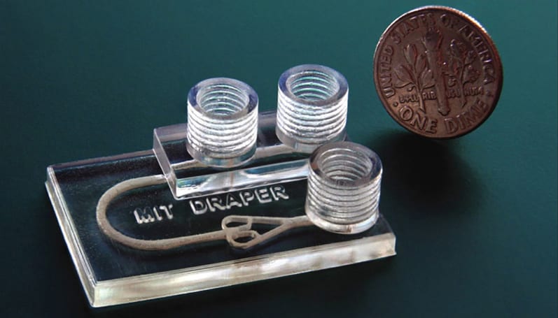 A 3D-printed microfluidic device was developed that simulates cancer treatments on biopsied tumor tissue so clinicians can examine how individual patients will respond to different therapeutics before administering a single dose. The device, which can be printed in about one hour, is a chip slightly larger than a quarter, with three cylindrical “chimneys” rising from the surface. These are ports used to input and drain fluids, as well as remove unwanted air bubbles. Biopsied tumor fragments are placed in a chamber connected to a network of channels that deliver fluids — containing, for instance, immunotherapy agents or immune cells — to the tissue. Clinicians can then use various imaging techniques to see how the tissue responds to the drugs.