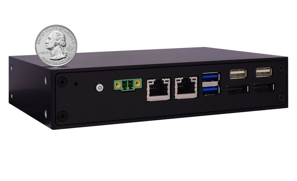It is housed in an aluminum enclosure that includes the computer, dual Gigabit Ethernet controllers, two USB 3.0 ports, two USB 2.0 ports, and dual DisplayPort outputs.