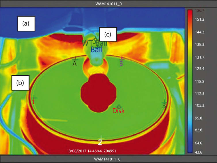 A test using a ball-on-disk tribometer slid a rolling silicon nitride ball against a steel rotating disk that was heated to 120 °C with a hot plate underneath. A stereo-optical microscope with a color charge-coupled device (CCD) camera and an infrared camera obtained thermal imaging data as the rotating speed of the disk sped up from 1 m/s to 16 m/s. Afterwards, an analysis of the wear tracks was done using a backscatter electron detector that mapped the elemental composition of the leftover film residue.