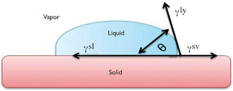 This measurement is performed by utilizing Young’s Equation which defines the balance of forces caused by a drop of liquid on a dry (perfectly flat/planar) surface. In the case of a hydrophobic or oleophobic coated surface the contact angle of a drop of water will be larger. The Young equation is calculated as follows: