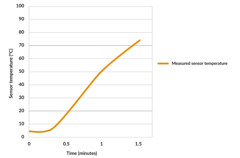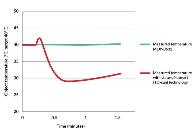 Figure 3b shows that, despite the thermal inertia due to the TO-can package, the conventional sensor’s output is heavily disturbed by the external heating. In contrast, the output of the actively compensated MLX90632 deviates by no more than 0.25°C, demonstrating considerably better stability.
