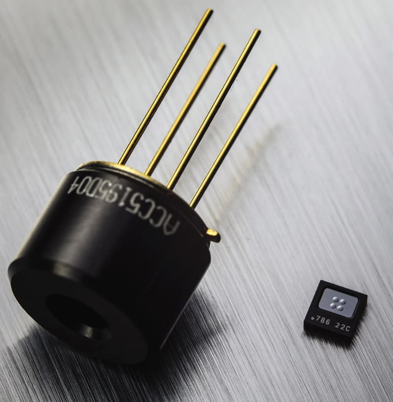 The Melexis MLX90632 non-contact FIR sensor comes in a 3×3×1 mm surface mount QFN package, which makes it especially well-suited for wearables, hearables, and portable medical body-temperature monitoring. Despite its extremely small size, it is highly accurate — the medical grade version is optimized for the normal human body temperature range and calibrated in the factory to ensure an accuracy of +/- 0.2°C. It is also relatively stable in the presence of ambient heat-disturbance scenarios.