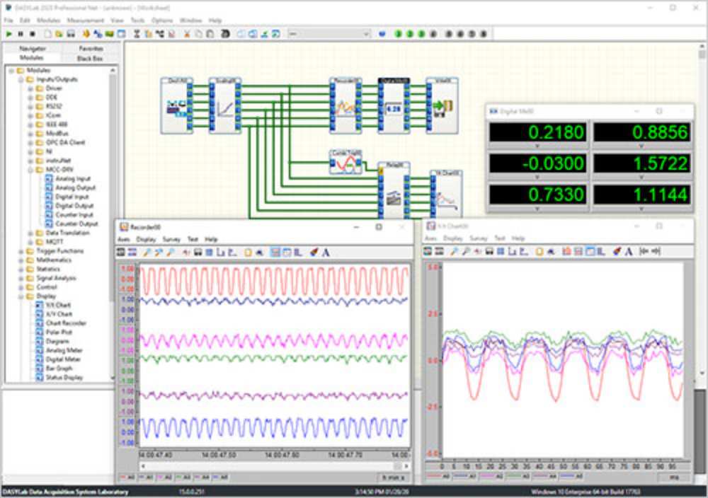 Measurement Computing Corp., Norton, MA, released DASYLab 2020 data acquisition software that allows users to interactively develop and deploy applications by connecting functional icons. It offers a number of analysis, control, and visualization modules for creating applications. By combining various function modules, users can turn a computer into an oscilloscope, multimeter, or data logger and analyze different signal types.