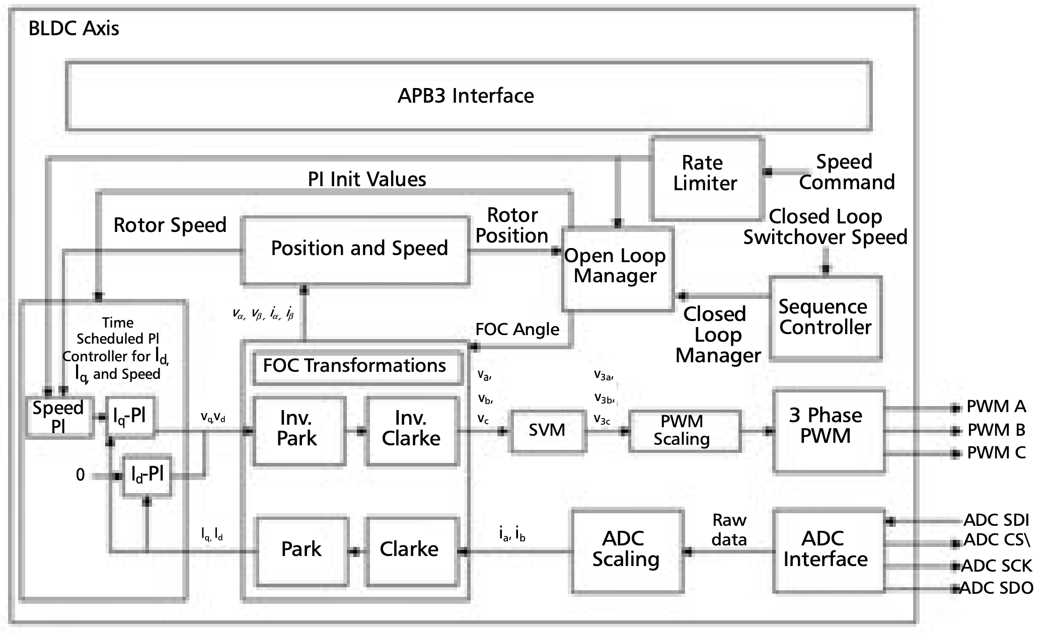 Sensorless field-oriented control (FOC) theory is one that is commonly applied in controlling basic permanent magnet synchronous motors (PMSMs) and brushless DC motors (BLDCs) using an FPGA, and is known for its precise, sensorless control while optimizing the use of control resources. The FOC system is composed of several algorithm blocks, each providing various control and feedback monitoring functions. Digital control systems communicate with the motors through voltage and current signals, and these algorithm blocks are instrumental in translating the necessary messages. FOC transformation blocks are there to ensure an optimum usage of resources: open-loop management blocks can calculate the position and speed of the motors, the rate limiter block programs a smooth transition as the motor changes speed, and there are a host of other blocks that perform a variety of other critical actions. Additionally, these blocks can often service multiple functions for fault detection and reset purposes. The openloop management blocks not only track motor position and speed, but also monitor the back-EMF from the motor, which can then be communicated to the rate limiter as motor feedback. The rate limiter can use this data to force the control output to zero instantaneously for an auto-restart if there is an irregularity in the back-EMF caused by an unknown exterior braking force, for example.