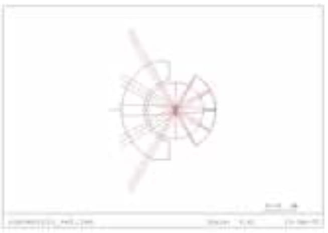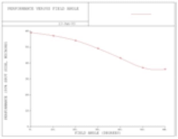 The concentricity of the design causes the performance to be nearly uniform across the field, since the ray angles on the air-glass interfaces are the same at any field angle. Variation in performance across the field is due only to the change in beam angle at the aperture stop, causing a truncation of the beam in one direction according to the cosine of the incidence angle. The example in Figure 2 has a 120° total field, and in principle this could be extended to nearly 180°, although the cosine falloff of the beam area would preclude a useful signal at angles at or near 180°. The variation in performance across the field is gradual, as shown in Figure 3, which plots the spot size at the focal surface in microns versus the field angle in degrees.