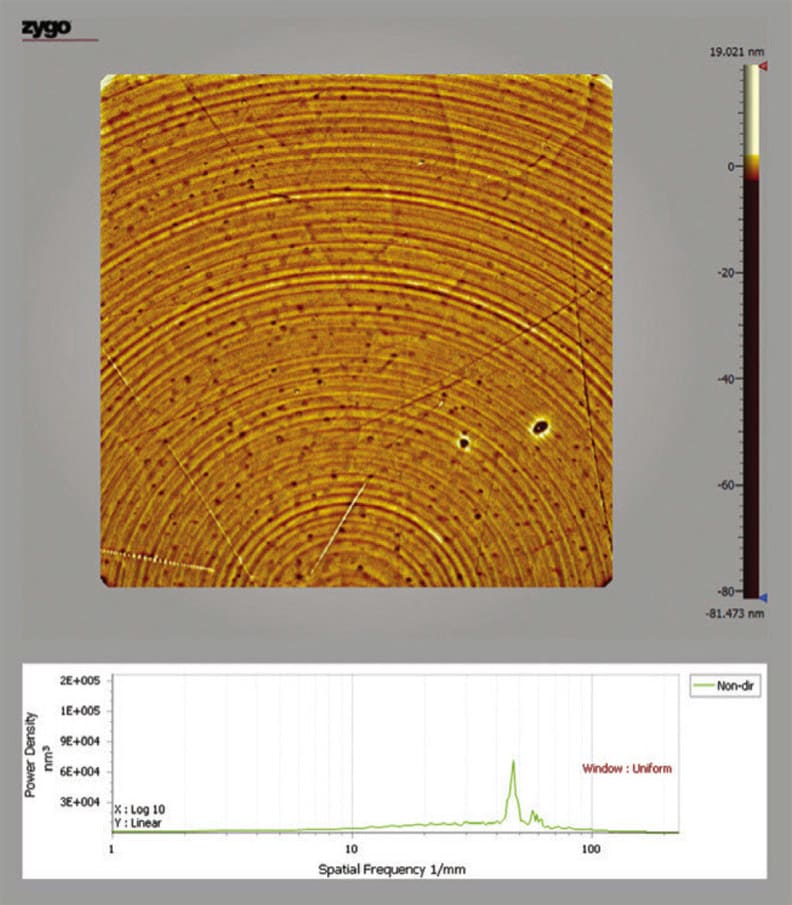 Another example of a surface where PSD is useful is shown in Figure 5, which is a diamond-turned optical surface with a clear, grooved structure that results from the single-point diamond-turning process. The PSD shows the frequency of this structure as a peak at 45 cycles per mm. A surface such as this is often perfectly acceptable for IR applications, but would be completely unacceptable for most visible and UV applications due to the significant scattering and imaging degradation that would result.
