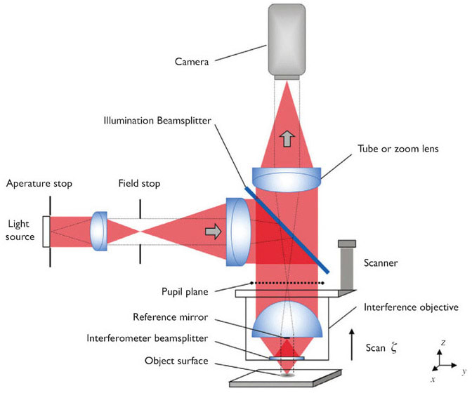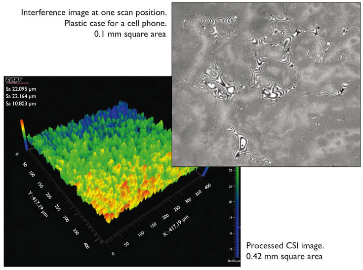 At the heart of the CSI profiling technology are specialized optical microscope objectives that not only provide the imaging and magnification of a surface, but also measure the 3D topography of that surface (Figure 1). The microscope’s illuminator projects light through the objective, where a beamsplitter sends some of the light to the reference mirror and some to the part under test.