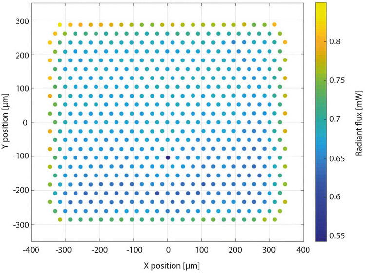 VCSEL arrays have additional needs for testing in production lines. Besides the optical spectrum and the light-current-voltage (LIV) curve, the shape and the numerical aperture of the far field radiation pattern, and the number and location of defect emitters on the chip are also important to measure (Figure 6). This requires additional production-grade spatial measurement equipment that offers high-stability and throughput at the same time. Commonly, the angle-dependent spatial radiation pattern of a light source is characterized with a goniophotometer. However, this very accurate method takes too long for sample inspection in production. Faster alternatives are either conoscopes or camera-based imaging systems, which observe the image of the light source on a screen. Independent of the exact system, its calibration is highly important for accurate optical measurements. All systems containing a camera require at least a flat-field calibration that takes care of artificial brightness variations of the image due to the measurement system. Further, an absolute calibration of the near-field measurement system is necessary if the radiant flux per emitter on the array is a target value.