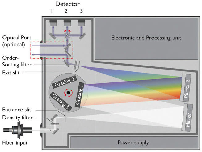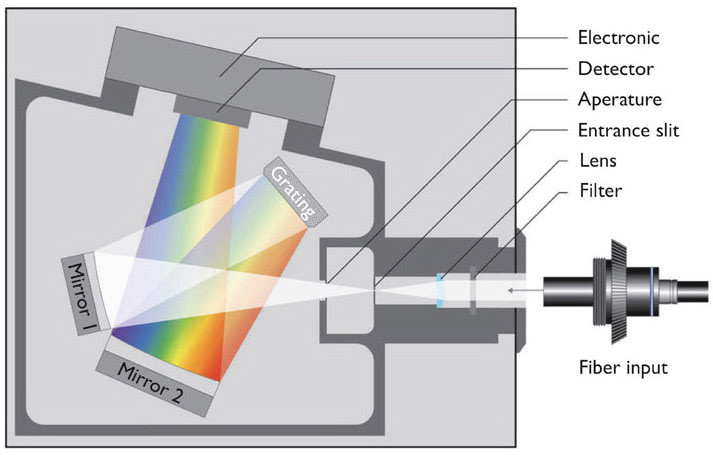 In comparison, array spectroradiometers (Figure 4) - long-established as a measurement solution in LED production - are ideal for use in the production of laser diodes. The fixed configuration of the optical components ensures a high degree of mechanical stability and high repeat accuracy of optical measurements. The spectrum is measured in an instant using an array detector. This enables integration times of just a few milliseconds for CCD detectors and microseconds for CMOS detectors, and an extremely high throughput rate.