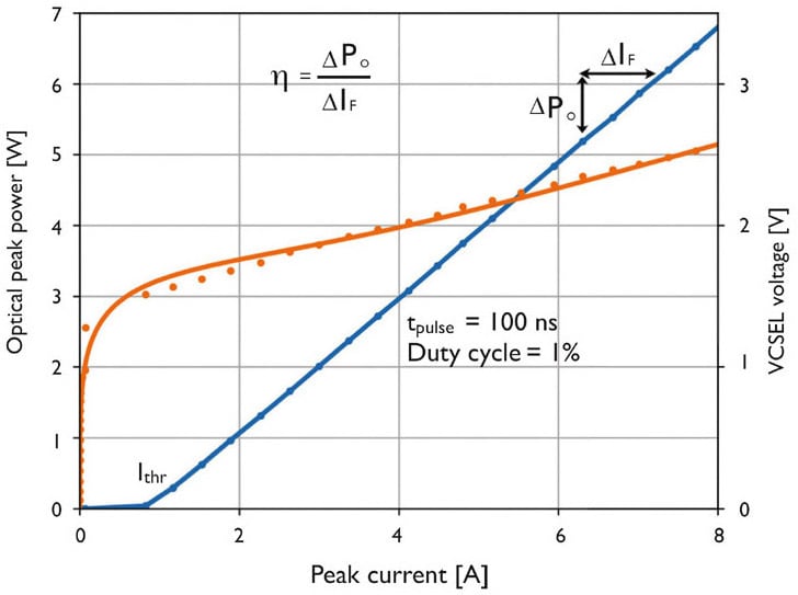 The in-line quality control of laser diodes requires electrical as well as optical tests. Typically, a production test system inspects the light-current-voltage (LIV) curve and the optical spectrum. Here, “light” means more precisely the radiant flux of the laser diode in watts, often simply denoted as optical power. The LIV curve shows how the voltage over the VCSEL and the radiant flux varies with the driving current (Figure 2). This allows testing key performance parameters of the VCSEL, like the slope efficiency (η) and the threshold current (Ithr).