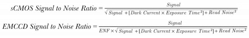 EMCCD cameras can exploit electron multiplication (EM gain) to amplify the signal many times before readout via a process called impact ionisation. This process introduces an additional noise factor, but it allows EMCCD cameras to mitigate read noise and operate at light levels well below that of back-illuminated sCMOS cameras. This is particularly relevant to single molecule studies with very low photon regimes and why EMCCD cameras are still recommended.