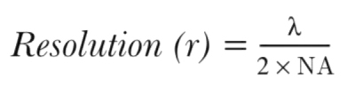 Another aspect of cameras that is related to sensitivity and resolution is pixel size. In simple terms, a larger pixel has a larger area to collect more photons; therefore it can allow for an improved signal to noise ratio (SNR). However, if the pixel size is too large, then we will not be able to resolve the full detail of the image. Conversely, going too small on pixel size to achieve high resolution will impact the SNR. Ideally, we need to have a pixel size that will sufficiently oversample the image so that we meet Nyquist criteria for the optical system. For a microscope this can be expressed as: