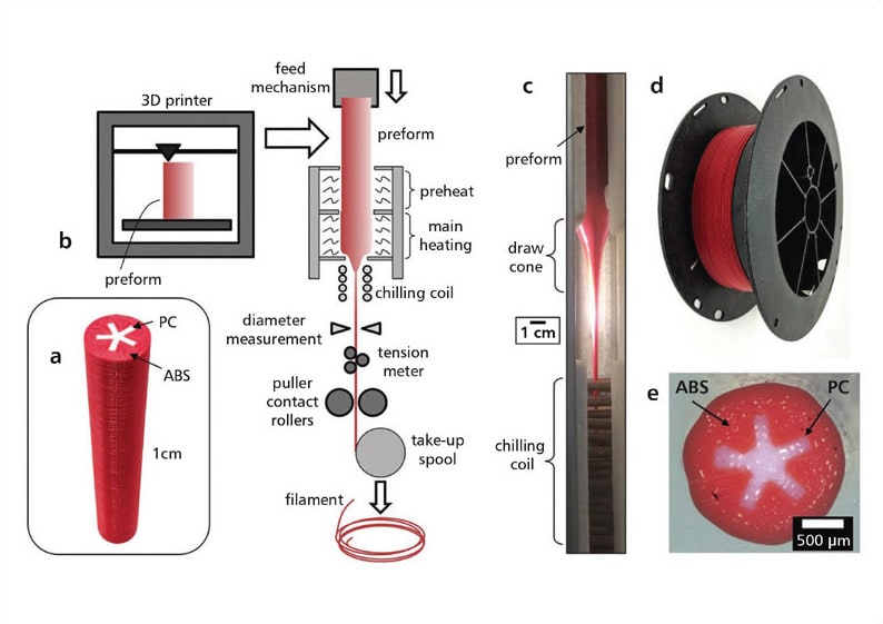 Fused filament fabrication (FFF) is the most common additive manufacturing technology but parts fabricated using FFF lack sufficient mechanical integrity for most engineering applications. The research team used a novel thermal draw process to fabricate a dual-material filament comprising acrylonitrile butadiene styrene (ABS) with a star-shaped polycarbonate core. This dual-material filament is then used as feedstock in a conventional FFF printer to create 3D solid bodies with a composite ABS/polycarbonate core meso-structure. This novel filament can allow low-cost printers to produce parts with mechanical properties competitive with injection molded plastics.