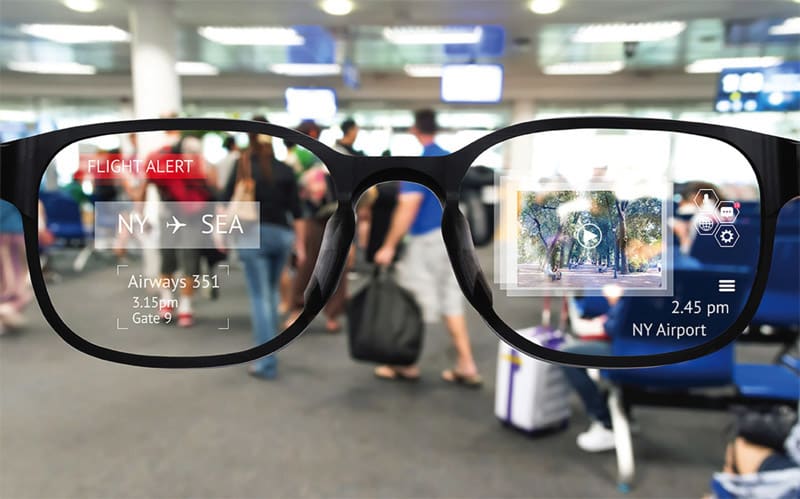 Those of us who wear vision correction glasses are used to seeing the world through lenses. New technologies will allow a virtual world to be layered on top of the real world that we normally see. The lenses will become displays that allow us to see the “real” world that is augmented with overlaid information and images, creating an Augmented Reality (AR). An example would be the integration of navigation into the AR glasses to allow a user to walk through town with turn-by-turn instructions (visual or verbal) to help them easily get to their destination. Other examples include facial recognition, fitness tracking, first-person photos and videos, as well as health-sensing and travel applications (Figure 1).