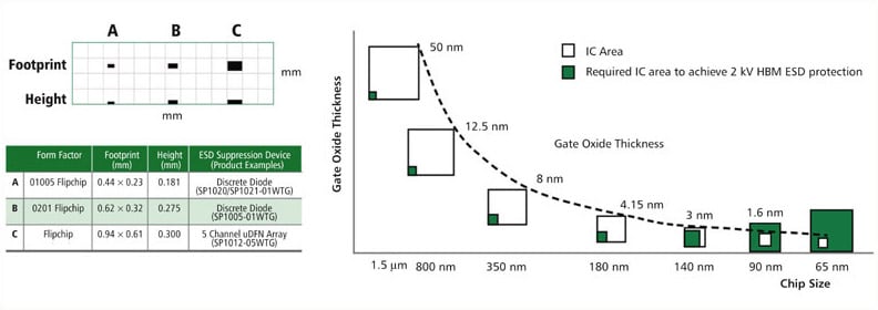 Today’s ESD diodes offer a variety of performance benefits for Augmented Reality applications led by a small form factor (Figures 2 and 3). The following recommendations for the selection and configuration of ESD diode technologies will help design engineers optimize their future circuit designs.