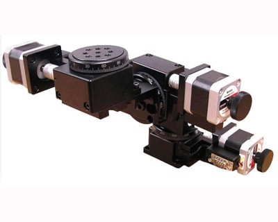 Optimal Engineering Systems (Van Nuys, CA) introduced three-axis miniature gimbal mounts with overall height less than 6.693". The YPR60-60-60-01 stepper motor-driven, YPR60-60-60-02 brushless servo motor-driven, and the YPR60-60-60-03 DC servo motor-driven are stacked precision rotary stages with positional accuracies of 0.05 degrees and repeatability of 0.01 degrees. Each axis is driven by a 180:1 worm gear. The top axis (roll axis) has a 2.362" diameter table and a pattern of threaded holes for fixtures or tooling. The maximum speed with stepper motors is 14 degrees/second and 45 degrees/second with servo motors. All axes have a HOME signal for initialization and each axis has a calibrated indicator to display the angle of rotation. The knobs of stepper motors can be replaced with optional optical encoders for position verification.