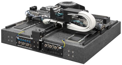 HEIDENHAIN (Schaumburg, IL) offers the ETEL VULCANO2 motion system for high throughput for heavy payloads in semiconductor manufacturing. It features gantry stacked-axes architecture, iron-core linear motors, and optical encoders. The direct drive system is designed for both front-end and back-end semiconductor applications requiring the movement of heavy payloads of up to 80kg. It features ±250 nm of bidirectional repeatability at 25 m/s2 acceleration, max speed of 1.2 m/s, and 80-mm move and settle to a ±100-nm window in maximum 170 ms. It offers a bottom-axes gantry design and an all iron-core motor. A granite base provides motion flatness at the tool point while minimizing accuracy losses when operating at high duty cycles. It also allows for dynamic cable routing through the granite, maximizing the ratio between dynamic performance and volume. The motion stage is shaped with XY and XYT configurations that allow for drop-in into equipment that previously utilized lower dynamic stages.