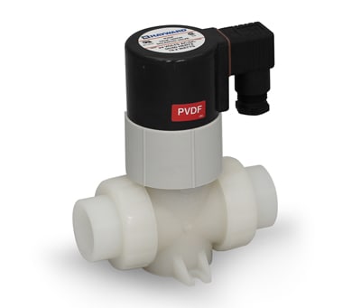 SV Series natural PVDF solenoid valves from Hayward Flow Control (Clemmons, NC) are available in sizes 1/2"/DN15 through 1"/DN25 with true union end connections for extremely corrosive, high-temperature, or sensitive media. The valves are continuous-duty-rated normally closed/fail closed valves that are pressure rated for 150 PSI/PN10 at 70 °F/23 °C non-shock across all sizes. FPM seals are standard, with EPDM optional. Maximum service temperature is 240 °F/115 °C. End connections available include socket fusion or threaded per ANSI or DIN/EN standards. Features include corrosion-resistant polyester coil, an integral footpad for skid or panel mount hermetic separation between the medium and solenoid, and 120 VAC standard with 220 VAC, 24 VAC, 12 VAC, 12 VDC, and 24 VDC options.