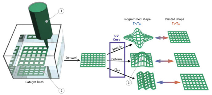 The researchers had to find a polymer mix that could be printed in a catalyst bath and still hold its original programmed shape. Parameters such as the solvents and catalyst used, degree of swelling, and ink formula had to be optimized to allow the ink to solidify rapidly enough to print while not inhibiting the desired final shape actuation.