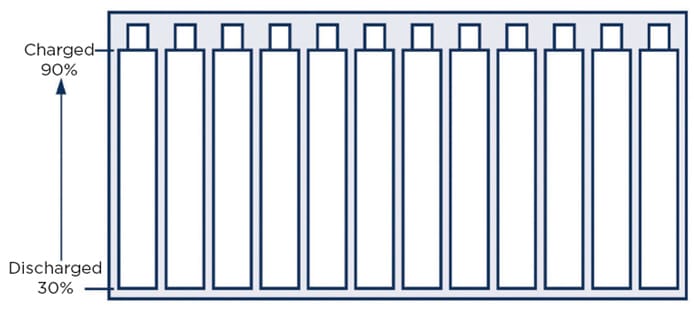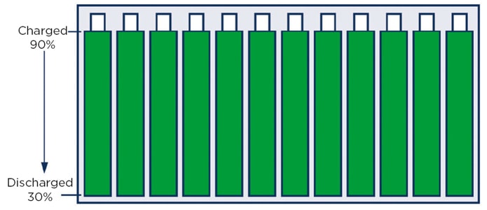 The diagram in Figure 1 represents a typical battery stack with all cells starting at full capacity. In this example, full capacity is shown as 90% of charge because keeping a battery at or near its 100% capacity point for long periods of time degrades its lifetime faster. The 30% discharge represents being fully discharged to prevent deep discharge of the cells.