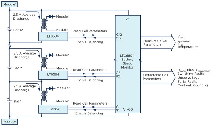 Active cell balancing controllers perform battery management, with the ability to match different system requirements and battery chemistries. Balancing is achieved by redistributing charge from one cell to the top of the battery stack or to another battery cell or combination of cells within the stack (Figure 5). A 2.5-A discharge current monolithic flyback converter was used in conjunction with multi-chemistry battery cell monitors. One flyback converter is used per battery cell.