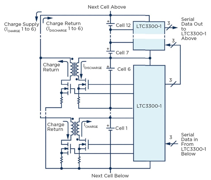 The use of a bidirectional controller allows charge from any selected cell to be transferred at high efficiency to or from 12 or more adjacent cells (Figure 6). This enables a single flyback controller to balance up to six cells.