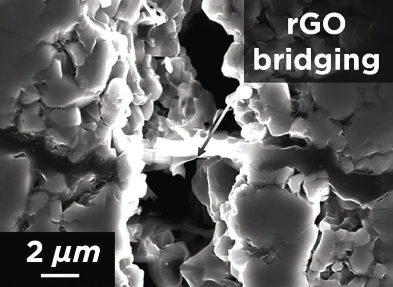 The researchers made tiny platelets of graphene oxide, mixed them with powder of a ceramic called LATP, and then heated the mixture to form a ceramic-graphene composite. Mechanical testing of the composite showed a more than twofold increase in toughness compared to the ceramic alone. When a crack starts in a material, the graphene platelets essentially hold the broken surfaces together so that more energy is required for the crack to spread.