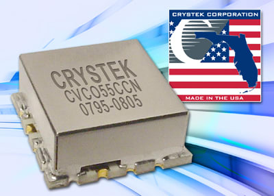 Crystek Corp., Fort Myers, FL, offers the CVCO55CCN-0795-0805 voltage-controlled oscillator that operates from 795 MHz to 805 MHz with a control voltage range of 0.5V ~ 4.5V.