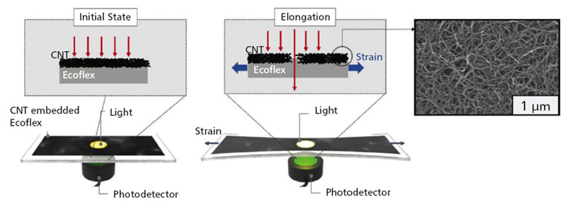 A research team suggested that an optical-type stretchable strain sensor can be a good alternative to resolve the limitations of conventional piezoresistive and piezocapacitive strain sensors because they have high stability and are less affected by environmental disturbances. The team then introduced an optical wearable strain sensor based on the light transmittance changes of a CNT-embedded elastomer, which further addresses the low-sensitivity problem of conventional optical stretchable strain sensors.