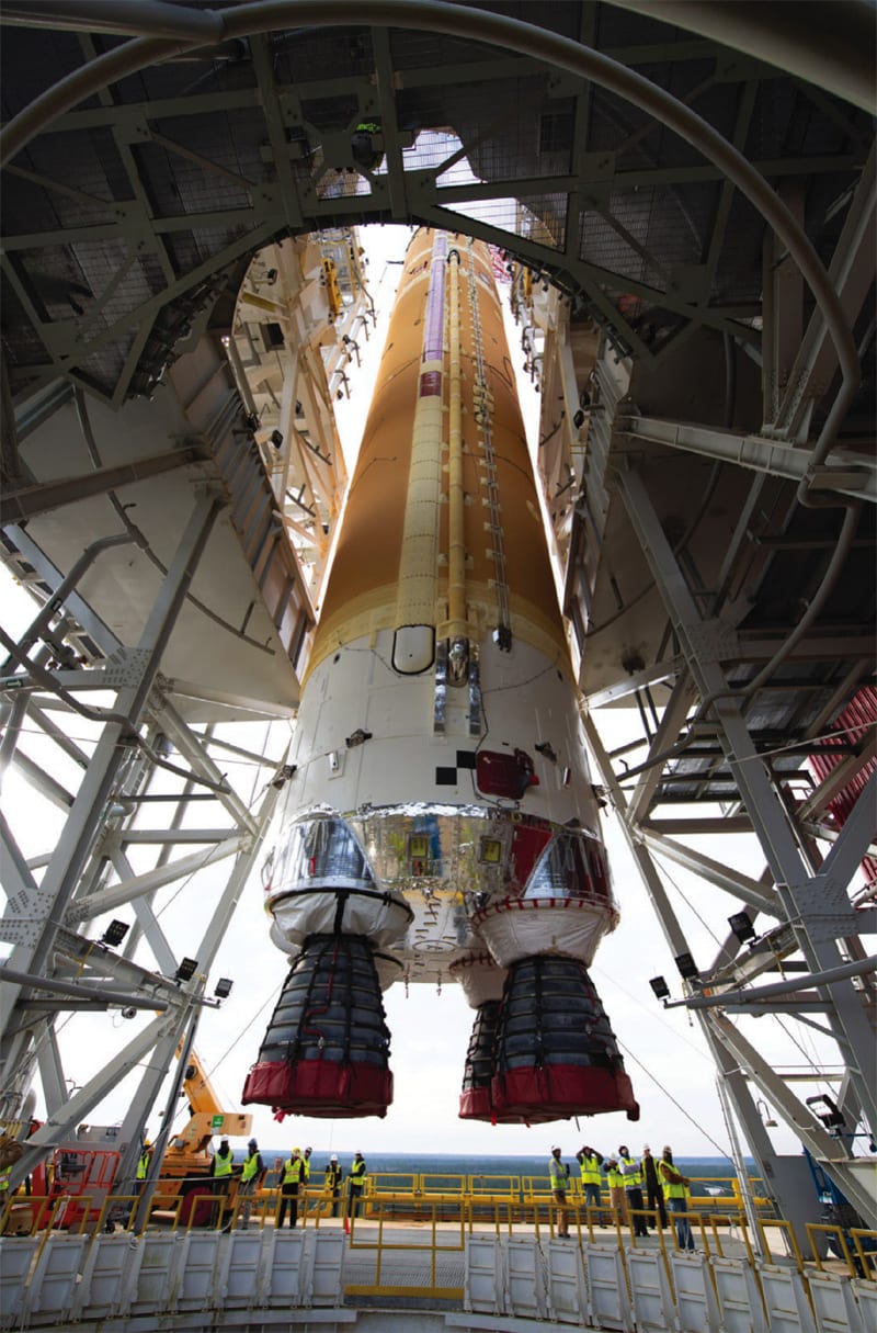 Once installed on the stand, operators begin testing each of the stage’s sophisticated systems. Among other things, they will power up avionics, conduct main propulsion system and engine leak checks, and check out the hydraulics system and the thrust vector control unit that allows for rotating the engines to direct thrust and “steer” the rocket’s trajectory.