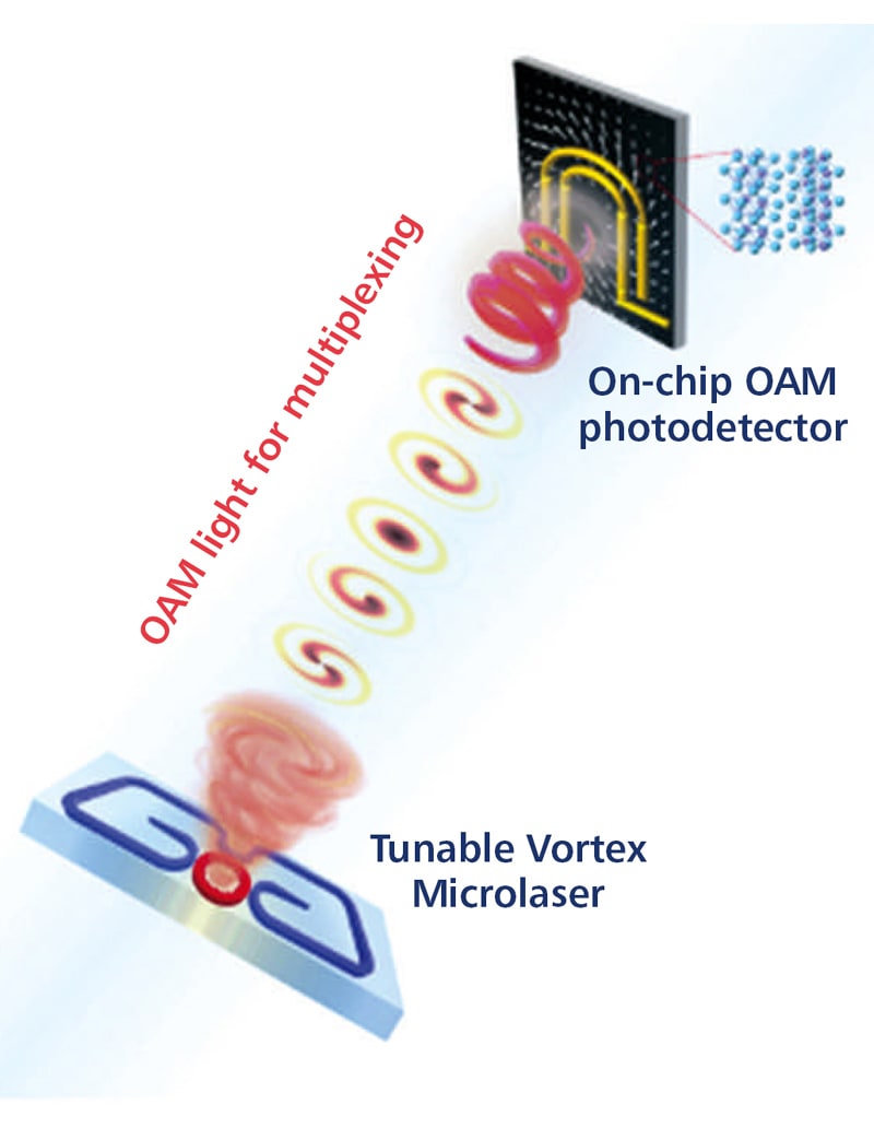 Researchers have developed a system that can manipulate and detect a property known as the orbital angular momentum (OAM) of light. Such “vortex” lasers, named for the way their light spirals around their axis of travel, were first demonstrated in 2016; however, they have been limited to transmitting a single, pre-set OAM mode, making them impractical for encoding more information. On the receiving end, existing detectors have relied on complex filtering techniques using bulky components that have prevented them from being integrated directly onto a chip and are thus incompatible with most practical optical communications approaches.