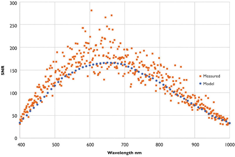 The SNR was modeled using the approach described above, with the integration time adjusted to match the setting used for the measurements and using the known radiance values from the integrating sphere. Plots of the SNR, measured and modeled, are shown in Figure 3.