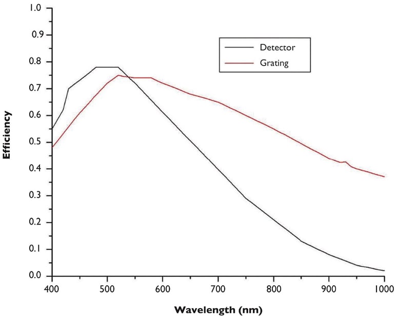 ε(λ) is the optical system efficiency which includes optical throughput of the lenses, the diffraction grating efficiency, and the detector quantum efficiency. The grating and detector efficiencies usually change significantly with wavelength and thus impact the wavelength dependence of the SNR. The overall efficiency is a product of the efficiencies listed above. Changing the efficiency requires changing components to the hyperspectral imager, which is not practical for most users.