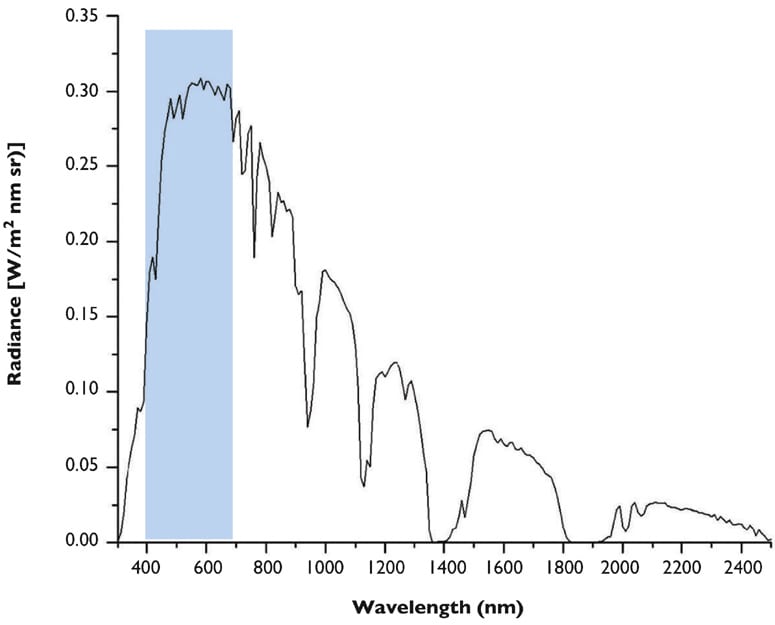 L(λ) is the at-sensor spectral radiance at wavelength in units of W/(m2 sr nm). In layman’s terms, this tells you the brightness of the light coming into the imager, usually from the object of interest. Thus, the information of interest is in this term. You can increase your Signal (and thus your SNR) with brighter illumination. Generally, the illumination changes with wavelength. For example, the signal from a Lambertian object with perfect reflectivity when illuminated by the sun in typical atmospheric conditions is shown in Figure 1. Note that illumination becomes weaker at both short (~400 nm) and long wavelengths, and thus the signal (and SNR) typically degrade at short and long wavelengths. The visible wavelength range is approximately 400-700 nm.