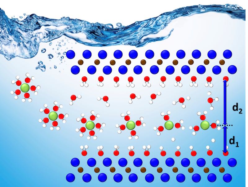 Using computational modeling, the team simulated the conditions of five different charged ions within the layers confined in an aqueous solution, or “water shell.” The theoretical model is simple, but combined with experimental data, it created a baseline that provided evidence of where the ions within the MXene layers went and how they behaved in a complex environment.